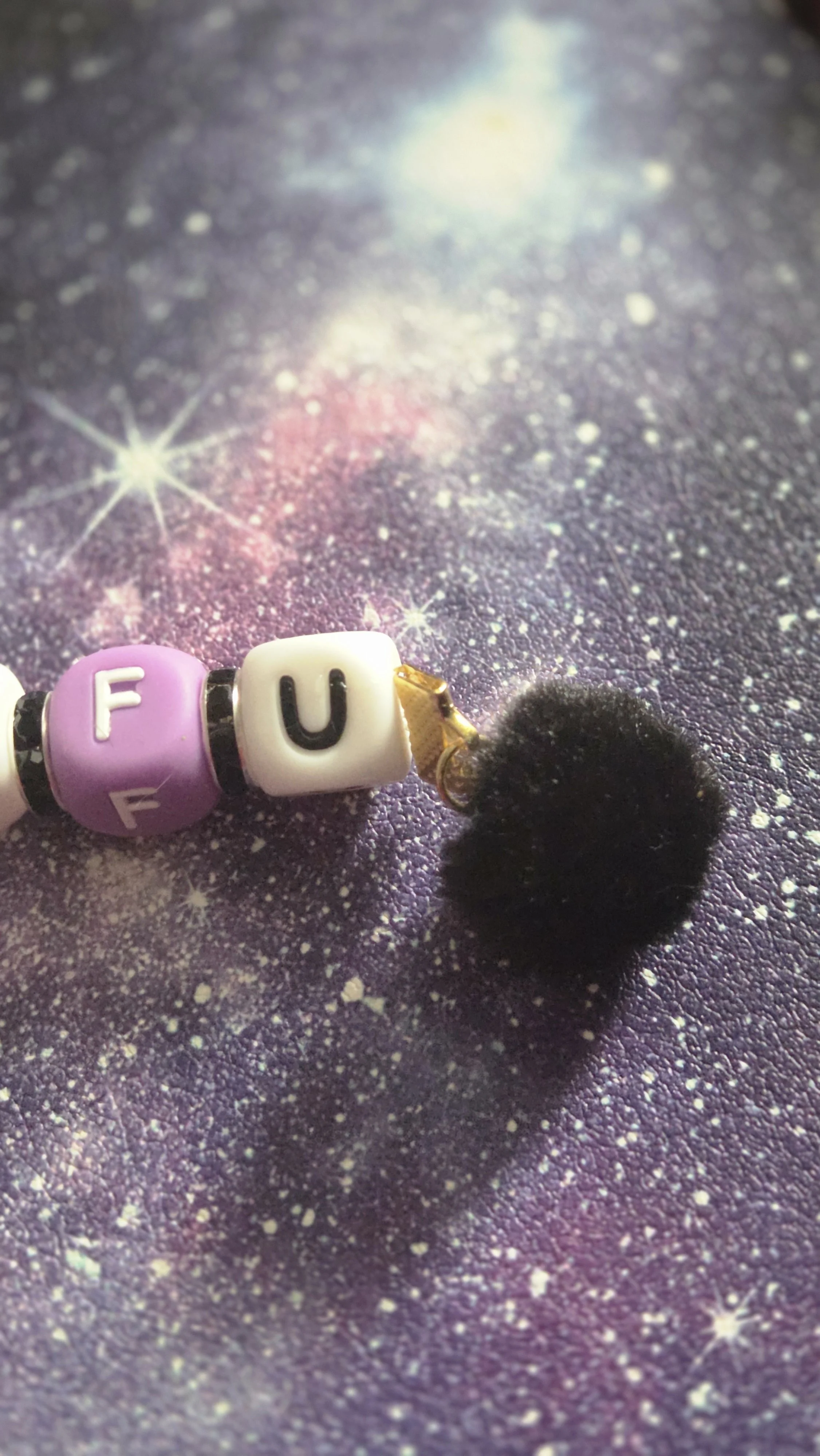 Each bead is smooth, durable silicone, giving the keychain a luxe yet practical feel. The subtle sparkle from the black spacers catches the light like distant stars, while the gold key ring adds a warm, vintage glow. Anchoring it all is a plush black pom pom charm that brings texture, movement, and just the right amount of gothic flair.